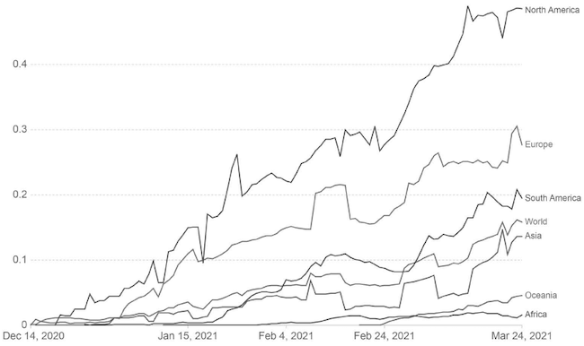 Al respecto, en la Imagen 3 puede verse cómo se avanza diariamente en el proceso de vacunación contra la Covid-19 a escala mundial y por región. Como puede verse, la tasa de aplicaciones es más elevada en Norteamérica que en Europa, pero en estas dos regiones es superior a cualquier otra, habiendo un retraso en la vacunación en Sudamérica a pesar de estar enfrentando a fines de marzo de 2021 el mayor pico de fallecimientos vinculados con esta enfermedad.