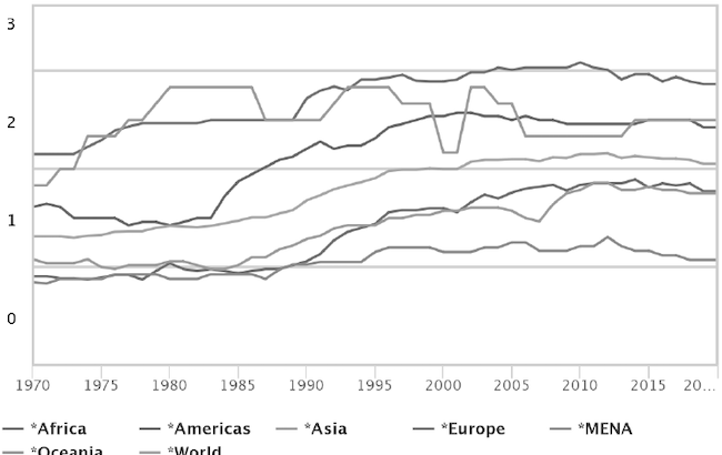 Un primer indicador es el reparto de los regímenes del mundo y por región según su condición de autocracia o democracia, que se presentan en la Imagen 7. Conforme a este estimador, es clara la mayor presencia de una democracia en Europa y su menor prevalencia en países de Medio Oriente y Noráfrica (MENA).