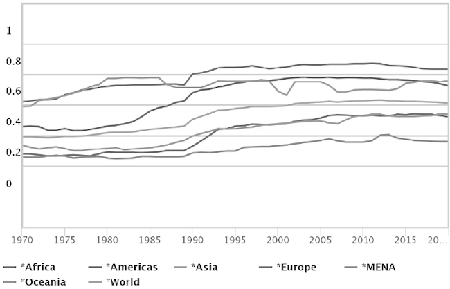 Finalmente, el más fino componente relativo a la democracia igualitaria, que se presenta en la Imagen 15, ha ascendido en los últimos años en las regiones de Oceanía y Asia, pero se ha reducido en Europa y las Américas. Es digno de mención que este índice no está calculado aún en todas las naciones para 2020, por lo que se omite el mapa correspondiente.