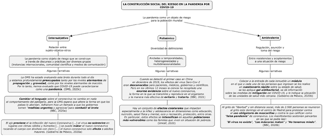 En este apartado se intenta plantear un vínculo entre el caso que aquí nos ocupa, la pandemia por la Covid-19 y sus efectos, con el marco teórico de la sociología del riesgo planteado anteriormente. La pregunta que guía esta sección es ¿por qué es indispensable comprender la pandemia de la Covid-19 como un objeto de riesgo? Responder a este cuestionamiento nos exige dialogar entre los discursos sociales que han construido la pandemia con las herramientas conceptuales a las que hemos apelado con antelación.