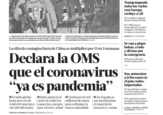 A nivel de temporalidad, habiendo mencionado que la OMS declaró oficialmente a la Covid-19 como pandemia, no se captaba plenamente la magnitud del desastre epidemiológico, y tampoco no se esperaba que fuera tan fatal, debido a una falta de comprensión de la lógica de transnacionalidad y conectividad tan imbricada en las lógicas del mundo actual (Therborn, 2020). Los diarios nacionales en México ya advertían que, a nivel mundial, la situación era crítica en el ámbito de la salubridad y de la conectividad, como en el económico y social (Imagen 3).