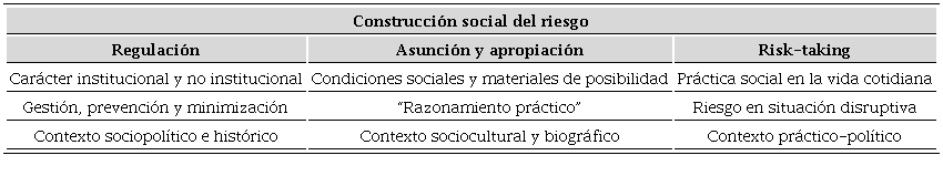 2. El riesgo tiene una naturaleza polisémica, que denota diversas definiciones que están constituidas por: a) temporalidad, como forma de estructurar el tiempo que implica vincular experiencias y expectativas; b) heterogeneidad, como vinculación de diferentes posiciones y contextos socioculturales; y c) multidimensionalidad, como intersección de tres escalas distintas de análisis, es decir, estructural, colectivo y biográfico.