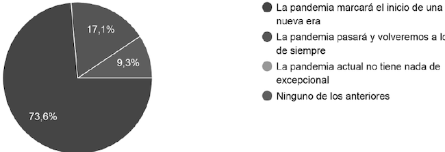 A diferencia del hecho o suceso, el acontecimiento marca una ruptura en la temporalidad, la inteligibilidad y la experiencia. Al indagar sobre este punto, encontramos que 73.6 % de los universitarios encuestados está de acuerdo con que “la pandemia marcará el inicio de una nueva era”, en contraste con 17.1 % que considera que “la pandemia pasará y volveremos a lo de siempre”. Cabe resaltar que, a pesar de no ser la primera pandemia en la historia de la humanidad y de que 48 % de los jóvenes manifestó estar de acuerdo con que las pandemias son fenómenos regulares que siempre han existido, ninguno de los estudiantes expresó estar de acuerdo con el enunciado “la pandemia actual no tiene nada de excepcional” (Gráfica 1).