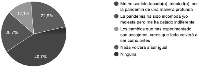 La perspectiva acontecial permite recuperar dentro del análisis sociológico la condición de pasibilidad de los sujetos, entendida como se señalaba en el apartado teórico, como la suceptibilidad del sujeto social de ser tocado, afectado, perturbado o conmovido por lo que sucede en el mundo que le rodea. La gran mayoría de los jóvenes que colaboraron con este estudio (85.7 %), experimentan la pandemia como un acontecimiento inesperado, algo que nunca pensaron o imaginaron vivir, no obstante que casi la mitad de ellos dijo estar de acuerdo con la idea de que la pandemia es un fenómeno regular que siempre ha existido. Al ser directamente cuestionados sobre si se han sentido “tocados” o “afectados” por la pandemia de una manera profunda, cuatro de cada diez contestó afirmativamente, mientras que sólo 20 % reconoció que la pandemia ha sido “incómoda” o “molesta” pero que “lo ha dejado indiferente”. Una quinta parte de los estudiantes considera que después de la pandemia “nada volverá a ser igual” (22.9 %), y únicamente 12 % dijo estar de acuerdo con que los cambios experimentados no serán duraderos (Gráfica 2).