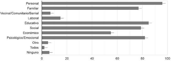 La ruptura en la temporalidad es una de las vivencias más claras con respecto a la pandemia. 80.9 % de los universitarios afirma que la pandemia es una ruptura importante en la temporalidad, que es vivida como un punto de inflexión que marca un antes y un después en algún aspecto de su vida. Los cuatro principales ámbitos en los que se manifiesta son: el personal (78.8 %), educativo (69.7 %), psicológico (67.2 %), y familiar (63.1 %). En cuanto a la dimensión económica, el 45.1% manifestó haber experimentado un quiebre importante, de manera consistente con la percepción de la reducción del ingreso a nivel nacional.13 (Gráfica 3).