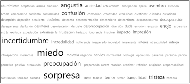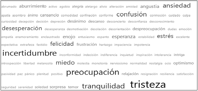Como señalábamos en el apartado teórico, la experiencia del acontecimiento está cargada de emoción. Al solicitar a los estudiantes la descripción por medio de tres palabras acerca de su estado de ánimo al inicio de la pandemia, expresaron sentir, por orden de relevancia: sorpresa, miedo, incertidumbre, preocupación, confusión y angustia (Figura 4). Actualmente, los universitarios cohabitan principalmente con emociones como tristeza, estrés, ansiedad, cansancio, desesperación y enojo (figura 5).14 En términos generales, la pandemia ha hecho sentir a las y los estudiantes universitarios: frustradas(os) (84.3 %); angustiados(das) (74.3 %); y vulnerables (70.7 %), pero también solidarias(os) (49.3 %). Tan sólo el 22.9 % dijo sentirse indiferente (22.9 %), o incrédulo (20.7 %) frente al acontecimiento.