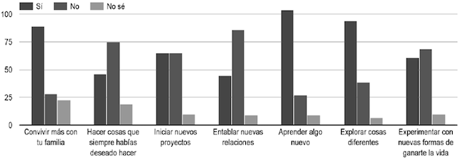 La pandemia ha abierto posibilidades para aprender (74.2 %) y explorar nuevas cosas (97.1 %), mejorar la convivencia familiar (63.5 %), así como incrementar su dedicación al estudio (61.4%). A diferencia del cierre de posibilidades como conocer nuevos lugares (2.1 %), entablar nuevas (32.1 %) o recuperar viejas amistades (27.1 %), hacer más deporte (35.7 %). La Figura 6 da cuenta de algunas de las posibilidades sugeridas a los estudiantes, se evidencia una clara contención a sus proyectos personales, aunque consideran que la pandemia abre la posibilidad de aprender nuevas cosas.