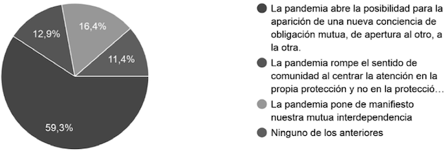 Finalmente, los estudiantes estuvieron de acuerdo en que la pandemia abre la posibilidad para la aparición de una nueva conciencia de obligación mutua, de apertura al otro, a la otra (59.3 %); en contraste, con que la pandemia rompe el sentido de comunidad al centrar la atención en la propia protección y no en la protección del otro y la otra (12.9 %) (Figura 7).