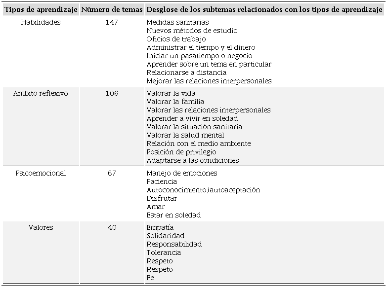Cuando se le preguntó a los 140 universitarios encuestados acerca de “lo que la pandemia les había permitido aprender” destacando tres aspectos, de los 360 temas analizados, fue posible develar cuatro grandes categorías ancladas en los ámbitos de las habilidades, la reflexividad, lo psicoemocional y los valores (Cuadro 1).