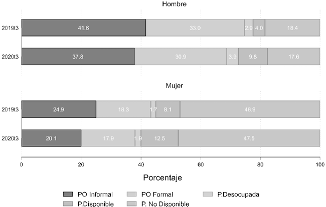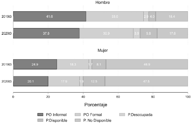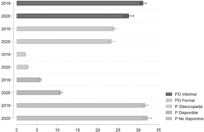 La gráfica muestra que existe un incremento significativo en relación con la población en edad de trabajar que está disponible para incorporarse al mercado laboral, situación que afecta tanto a hombres como a mujeres. En los hombres la participación de esta categoría en 2020 es dos veces mayor con respecto a 2019, mientras que en las mujeres hubo un aumento en la disponibilidad de sólo cuatro puntos porcentuales aproximadamente. Por otro lado, se puede observar un descenso en la ocupación, ya que los datos evidencian cómo al interior de los ocupados la presencia del empleo informal disminuyó, en términos porcentuales, más que el empleo formal. Este crecimiento de la disponibilidad refleja diferenciales fundamentalmente por género, en relación directa con los impactos que la pandemia ha tenido en las mujeres y en los tiempos que deben destinar a actividades no remuneradas que se han cargado sustancialmente en ellas y que, por ende, han inhibido la búsqueda de empleo en el mercado. El estancamiento en la participación económica de las mujeres puede avizorarse como uno de los efectos que la pandemia tiene sobre la fuerza de trabajo y el mercado. En esta línea será necesario avanzar en análisis que posibiliten diferenciar estos efectos por tipos de ocupaciones, por territorios, por características sociodemográficas, entre otras.