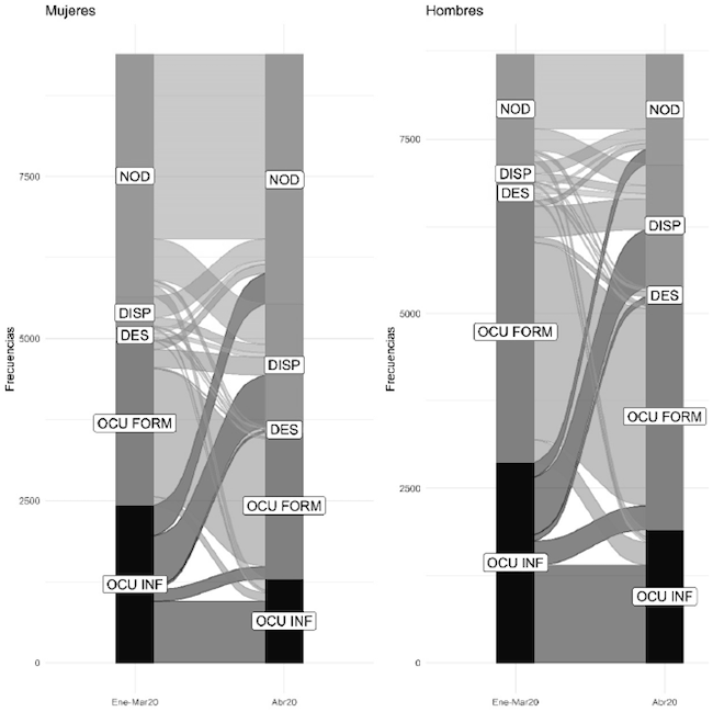 Al analizar los volúmenes o números absolutos, es fácil reconocer que la salida del mercado laboral es mucho más grande para aquellos empleados informales que para los ocupados formales. Esto ocurre como respuesta a las condiciones estructurales del mercado de trabajo mexicano, donde la existencia de empleos sin garantías jurídicas y con altos grados de precariedad propician la salida masiva de trabajadores desprotegidos. Y evidencia las desigualdades estructurales del mercado de trabajo que impactan siempre de forma más cruda sobre los mismos grupos de personas trabajadoras. La informalidad fue analizada por el PREALC en vinculación con la generación de procesos de marginalidad y exclusión hace 50 años, tal y como podemos volver a encontrar en nuestra realidad actual; son las personas en los nichos laborales informales quiénes vuelven a constituirse como excedentes del mercado de trabajo.