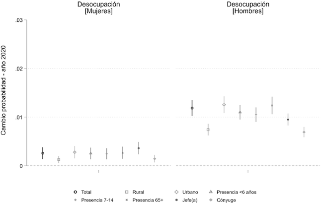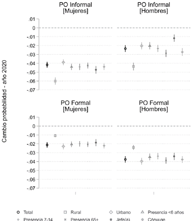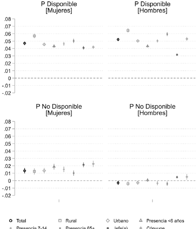 La probabilidad de estar disponible aumentó aún más en quienes residen en zonas rurales. En el caso de las mujeres, en hogares con presencia de adultos mayores tienen aumentos en las probabilidades ligeramente más altas, mientras que ser jefa o cónyuge en hogares con presencia de niños y niñas pequeños hace que los aumentos sean ligeramente menores. En el de los hombres, las diferencias en los perfiles son más claros, un hombre que reside en un hogar con presencia de adultos mayores tuvo cambios en las probabilidades de estar disponibles más altos que el promedio de varones, del mismo modo para aquellos que residen con personas adultas mayores. Estos datos pueden indicar que existen estrategias dentro de los hogares ante el riesgo más alto por salud que tienen los adultos mayores para salir a trabajar. Mientras, los jefes de hogar con presencia de menores de 0-5 años tienen cambios mucho menores para estar en esta categoría.