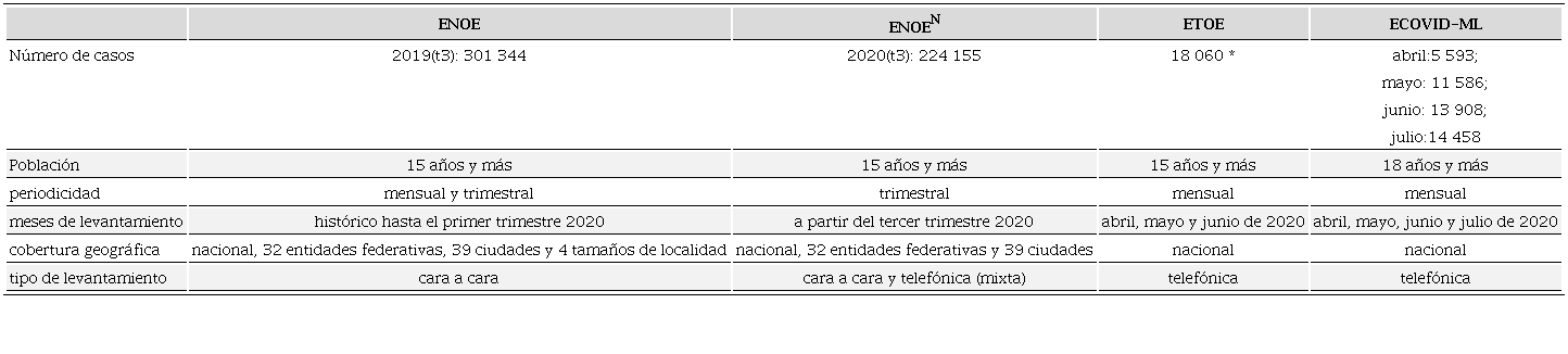 En este artículo se presentan y analizan datos provenientes de cuatro fuentes de información, todas ellas levantadas y publicadas por el INEGI, a saber: la Encuesta Nacional de Ocupación y Empleo (ENOE), la Encuesta Nacional de Ocupación y Empleo Nueva Edición (ENOEN), la Encuesta Telefónica sobre Covid-19 y Mercado Laboral (ECOVID-ML) y la Encuesta Telefónica de Ocupación y Empleo (ETOE).