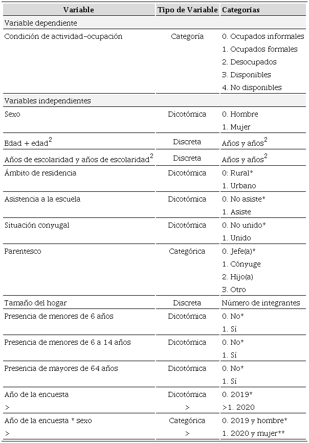 Para cumplir con los objetivos planteados y delinear posibles respuestas a las interrogantes que guían la investigación, el trabajo quedó estructurado de la siguiente manera, además de esta breve introducción: a) presentación y discusión de los aspectos teóricos-conceptuales relacionados con las categorías analíticas centrales (como son la ocupación, la desocupación y la disponibilidad para trabajar); además de revisar la realidad de los mercados laborales y los efectos que la pandemia ha tenido sobre estos en los últimos meses; b) presentación de las cuatro fuentes de información utilizadas, donde se especifican sus particularidades temáticas y técnicas, lo que permite delimitar sus posibilidades y limitaciones; c) revisión, a partir de las principales variables, de algunos cambios observados en la población en edad de trabajar antes y durante las medidas de confinamiento, así como el escenario de la nueva normalidad; d) descripción teórica de la construcción de los modelos de regresión logística multinomial, mostrando sus posibilidades y ventajas analíticas e interpretativas para posteriormente, en el siguiente apartado, presentar, discutir y analizar los resultados derivados de la aplicación de la técnica multivariada. Recurrir a un modelo inferencial de este tipo permitió delinear escenarios que reflejan los cambios en las probabilidades de pertenecer a las categorías de condición de actividad y empleo formal o informal dado un conjunto de variables explicativas o independientes; y, finalmente, e) conclusiones, en las que se discuten los resultados del trabajo empírico a la luz de la revisión teórica y conceptual desarrollada.