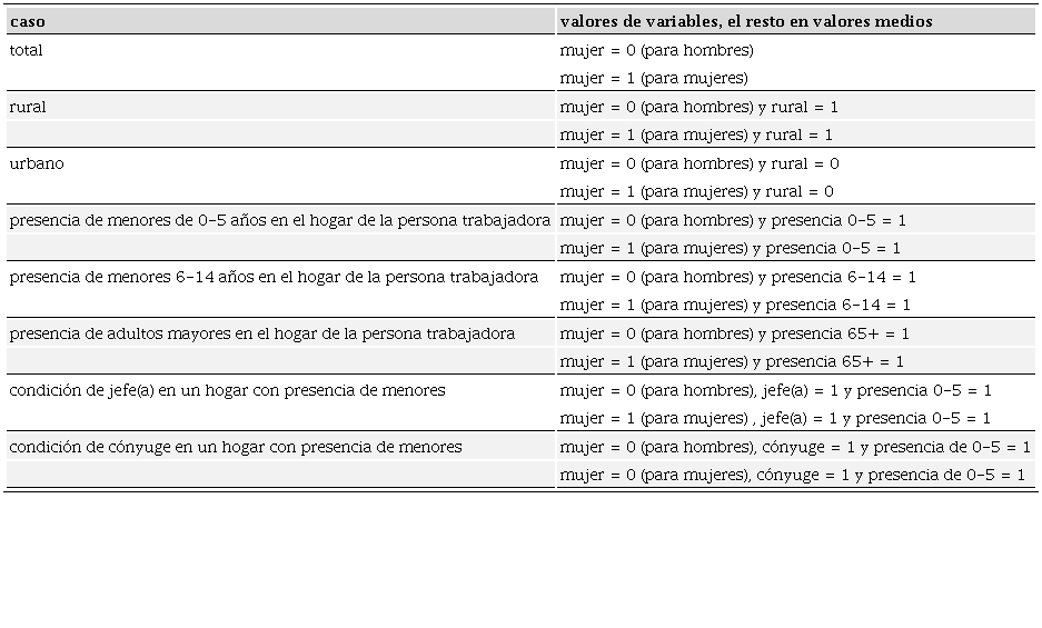 Cabe señalar que las cargas domésticas devenidas de la presencia de población dependiente juegan un papel central en cómo las mujeres se incorporan en el mercado de trabajo (Escoto, 2020; Orozco, 2015). Sin embargo, no incluimos las horas de trabajo no remunerado dentro del hogar como una variable explicativa debido a que en la ENOE se recoge el cuidado “exclusivo”. Este tipo de cuidado no se ha visto incrementado en términos horarios, pero sin duda, se ha incrementado en intensidad, y su invisibilidad dada la multiactividad de las mujeres (PNUD, 2020). Debido a la expansión del tiempo en el espacio doméstico, en la encuesta se registra un ligero aumento de las horas de trabajo no remunerado llevado a cabo por hombres. Debido a que una medida horaria no refleja las condiciones del trabajo no remunerado dentro de los hogares decidimos excluirlas de nuestro análisis.