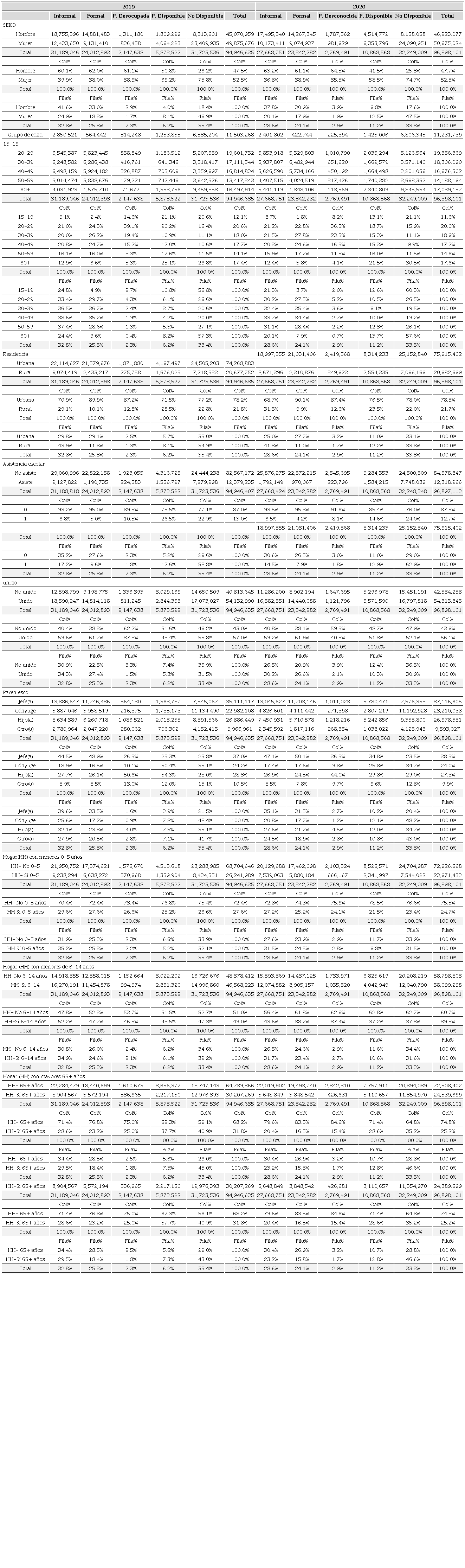 Es importante mencionar que las diferencias entre estas proporciones en 2019 frente a 2020 son estadísticamente significativas al 0.05, a excepción de los cambios en la población femenina con empleo formal y también para las mujeres en condición de no disponibilidad para trabajar.