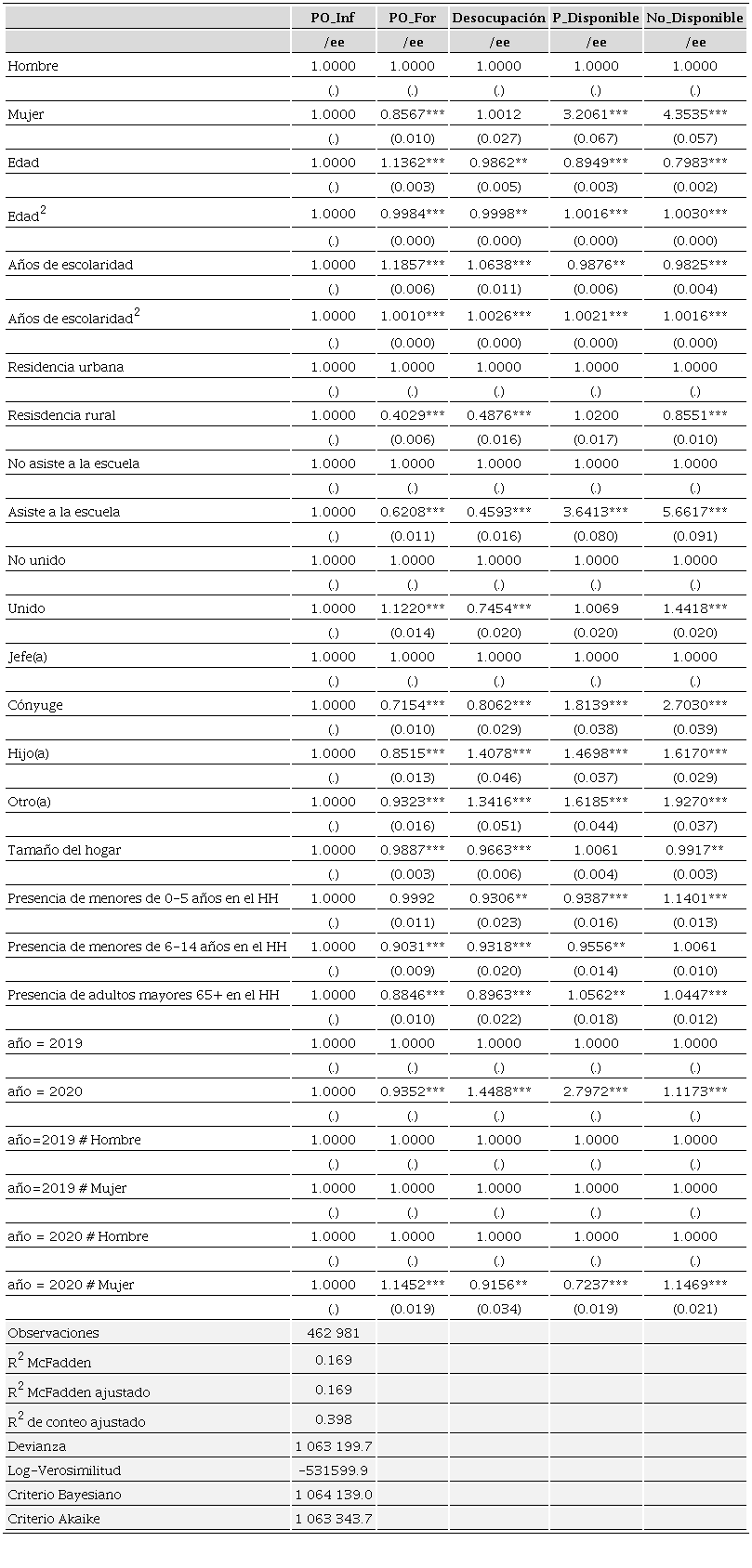 Para dar el siguiente paso y poder aislar el efecto de lo sucedido en 2020 frente a la realidad del 2019, además de poder explicar lo descrito antes, recurrimos a un modelo estadístico multivariado de tipo logístico multinomial. Si bien, y como ya se señaló, en este último trimestre se ha visto una ligera recuperación en los niveles de ocupación, es importante revisar en términos explicativos cómo han cambiado las oportunidades de estar en algunas de las categorías de actividad económica y ocupación informal y formal estudiadas.