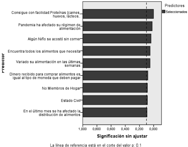 Las variables, posibles predictoras o aquellas que evidencian relaciones estadísticamente importantes, en un nivel de significación de 1 %, 5 % y 10 % respectivamente, con relación a la variable dependiente o VD: “Recibe ayuda de organismos públicos y/o privados para su alimentación diaria”, quedaron expuestas en la Tabla 2 y el Gráfico 1.