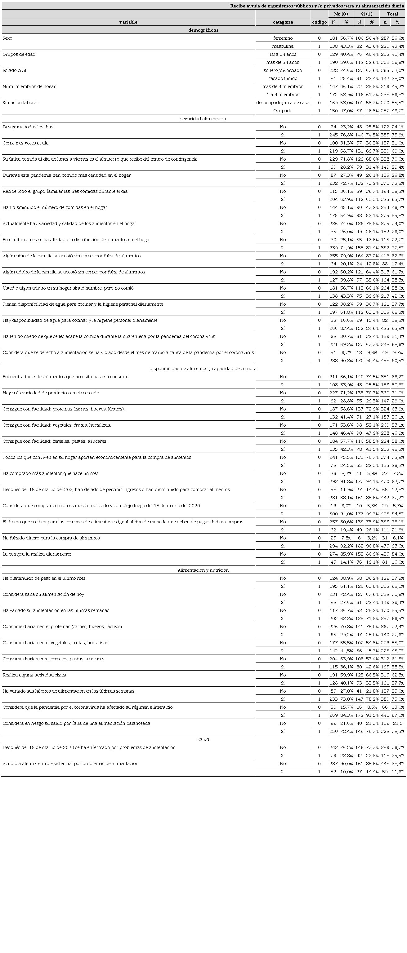 En la Tabla 1 quedaron expuestas las variables consideradas en el estudio, integradas en cinco grupos de macro factores como lo son: (1) Características sociodemográficas; (2) Seguridad Alimentaria; (3) Disponibilidad de alimentos y capacidad de compra; (4) Alimentación y Nutrición; (5) Salud.