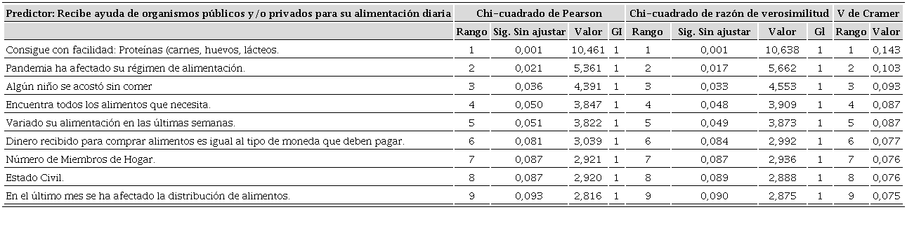 En cuanto a las variables: Consigue con facilidad proteínas (carnes, huevos, lácteos…) (p< 0.01, V =0.143); La pandemia ha afectado su régimen de alimentación (p< 0.05, V =0,103) y Algún niño se acostó sin comer (p< 0.05, V =0.093), presentan una evidencia de relación estadísticamente significativa o de mayor asociación con la VD: “Recibe ayuda de organismos públicos y/o privados para su alimentación diaria”.