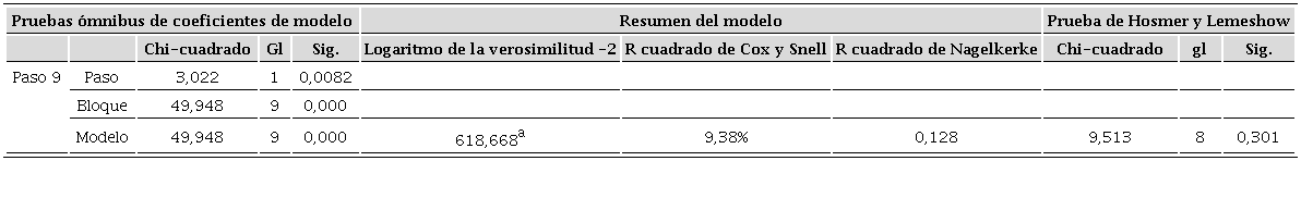 En la Tabla 3 se muestra el resumen general del modelo y allí la prueba ómnibus determina que el modelo de regresión logística resultó estadísticamente significativo (X2=49,948, p < 0.0005). La estimación del método converge a la solución en 5 iteraciones, el valor del estadístico log de la verosimilitud (-2LL) o desvianza de 618 668 significativo midió hasta qué punto el modelo se ajustó a los datos. El Pseudo R cuadrado de Cox y Snell estima un valor de 9.38 %, indicó la proporción de la varianza como explicada por la variación de las variables explicativas del modelo.