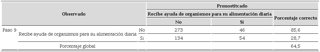 La Tabla 4 permite identificar el porcentaje correcto de clasificación global, el cual se ubicó en 64.5 % de los 507 casos estudiados. De estos, 188 casos manifestaron sí recibir ayuda de organismos públicos o privados para su alimentación diaria, y clasifica correctamente a 54 (verdaderos positivos) que representa un porcentaje de 28.7 % (sensibilidad del modelo). De los 319 que manifestaron no recibir ayuda de organismos para su alimentación diaria, clasifica correctamente a 273 (verdaderos negativos) lo cual representa 85.6 % (especificidad del modelo).