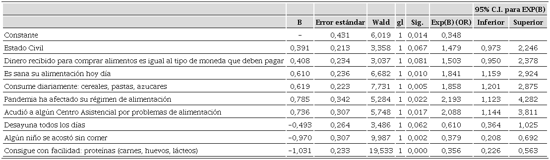 En consecuencia, del total de variables predictoras, sólo nueve resultaron estadísticamente significativas y explicativas, razonablemente, en 64.5 %, con respecto a lo planteado en la variable dependiente: “Recibe ayuda de organismos públicos y/o privados para la alimentación diaria”; (1) Estado Civil, OR=1,479, IC 95 % [ 0.973 a 2 246], p=0.067; (2) Dinero recibido para comprar alimentos es igual al tipo de moneda que deben pagar, OR=1 503, IC 95 % [0.950 a 2 378], p=0,081; (3) Es sana su alimentación hoy día, OR=1 841, IC 95 % [1 159 a 2 924], p=0.010; (4) Consume diariamente: cereales, pastas, azúcares, OR=1,858, IC 95 % [1,201 a 2,875], p=0.005; (5) La pandemia ha afectado su régimen de alimentación, OR=2,193, IC 95 % [1 123 a 4 282], p=0.022; (6) Acudió a algún centro asistencial por problemas de alimentación, OR=2 088, IC 95 % [1 144 a 3 811], p=0.017; (7) Desayuna todos los días, OR=0.610, IC 95 % [0.364 a 1 025], p=0.062; (8) Algún Niño se acostó sin comer, OR=0.379, IC 95 % [0.208 a 0 692], p=0.002; (9) Consigue con facilidad: proteínas (carnes, huevos, lácteos, entre otros) OR=0.356, IC 95 % [0.226 a 0.563], p=0.000.