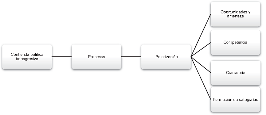 En un episodio de contienda hay una combinación de mecanismos y procesos. El estudio de la contienda plantea tres aspectos clave: 1) los mecanismos causales, 2) los procesos y 3) los episodios. En la forma de contienda transgresiva hay secuencias de mecanismos que derivan en procesos más amplios. Uno de estos procesos es el de polarización de la contienda; se trata de la ampliación del espacio político y social entre los reivindicadores que participan en un episodio de contienda y la gravitación de actores más moderados o que se encontraban desmovilizados hacia alguno de los dos polos involucrados. Cuando este proceso tiene lugar hay un vaciamiento del centro político, las coaliciones previamente establecidas podrían llegar a fracturarse y, en este esquema de divisiones o polarización, los temas de la agenda política adquieren un sentido ideológico. En el marco del gobierno, se limitan las posibles vías de solución, alentando mecanismos de represión que dan lugar a conflictos armados o guerras civiles. En la polarización de la contienda se combinan cuatro mecanismos: las oportunidades y amenazas, la competencia, la correduría y la formación de categorías (McAdam, Tarrow y Tilly, 2005: 357-359).