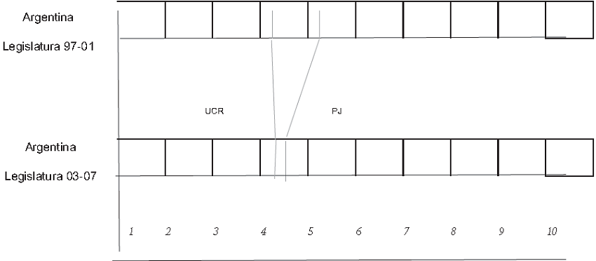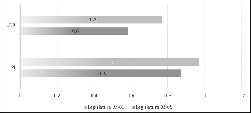 La Figura 3 muestra los resultados obtenidos en el cálculo de coherencia ideológica de los miembros de los partidos parlamentarios UCR y Partido Justicialista (PJ) en Argentina en dos periodos legislativos diferentes. La barra superior (en un gris más claro) se refiere al momento previo al desarrollo del episodio, mientras que la barra inferior (en un gris más oscuro) se refiere al momento posterior. Como se advierte, tanto el partido Justicialista como el Radical muestran cambios en el indicador de coherencia ideológica. En el primer periodo legislativo se observan valores más elevados, lo que supondría que existía menor grado de coherencia ideológica. Posiblemente, esto denota la inestabilidad política que precedió al conflicto de los Saqueos y el Cacerolazo, con vínculos endebles entre el Partido Radical y FREPASO, así como el enfrentamiento de las distintas facciones del justicialismo. En el segundo periodo sí se advierte una mayor coherencia ideológica, lo que en principio nos llevaría a concluir que el factor ideológico cobró preponderancia al interior de los partidos.