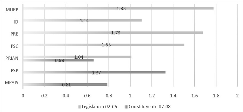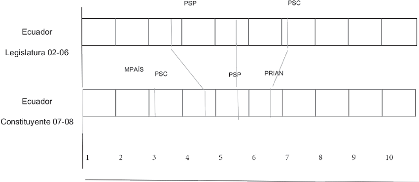En el caso de Ecuador es importante la interpretación de los grados de polarización en función del grado de fragmentación parlamentaria. En el primer periodo, el grado de fragmentación era 0.84. Esta alta fragmentación con niveles elevados de polarización apunta hacia una inestabilidad política que quizá configuró una estructura de oportunidades políticas para la Rebelión de los Forajidos. En el segundo periodo, con la mayoría de más de 60 % de MPAÍS dentro de la asamblea constituyente, la fragmentación descendió hacia un 0.61. La fuerza de una mayoría frente a una presencia casi marginal de los partidos de oposición dibuja un escenario en el que una mayoría se impone. No obstante, los niveles elevados de polarización sí nos revelan distanciamientos ideológicos que, si bien no denotan inestabilidad por la existencia de una mayoría fuerte, si muestran la existencia de ideologías diferenciadoras entre los partidos, más acentuada en el segundo periodo.