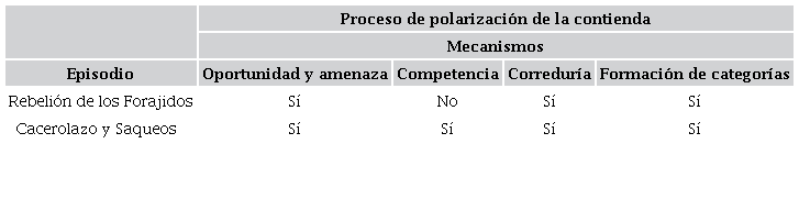 Los episodios descritos muestran los mecanismos que se articulan en el proceso de polarización. En ambos casos, la adopción de medidas económicas restrictivas en el tema social configuró la amenaza. El contexto político y la actitud represiva del Estado fueron incentivos de una acción colectiva más generalizada y beligerante. Como describe la teoría de la contienda, dentro del mecanismo de polarización existe una espiral de oportunidad y amenaza. En paralelo a la amenaza, la división de las élites, la ruptura de las coaliciones políticas existentes o el desplazamiento de lealtades entre la élite política y militar figuraron como estructura de oportunidades.