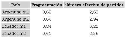 La fragmentación se refiere a la probabilidad de que dos electores, seleccionados al azar, elijan opciones políticas distintas. Es un indicador que se aproxima al grado de competitividad que presenta un sistema de partidos al reflejar la probabilidad de que cualquiera de las ofertas partidistas pueda ganar. Este indicador, junto al de número efectivo de partidos parlamentarios, complementa los datos obtenidos con el indicador de polarización. Un sistema fragmentado no necesariamente revelaría inestabilidad, pero, tal como apuntan Sani y Sartori (1983), valores altos de polarización con una alta fragmentación serían una pauta de inestabilidad política. El número efectivo de partidos parlamentarios habla del número de partidos relevantes al interior del Congreso. En los supuestos de alta polarización, podría indicar inestabilidad política por la dificultad de lograr consensos entre las élites, sobre todo cuando algunos de los partidos relevantes se alejan de las posturas ideológicas de los otros partidos.