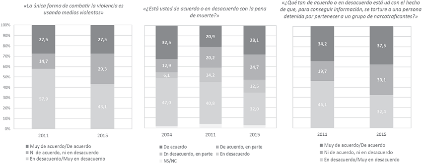 De acuerdo con la Gráfica 1, si bien la aprobación de medidas violentas se ha mantenido estable, su impugnación ha descendido de 57.9 % en 2011 hasta 43.1 % en 2015, aumentando no obstante quienes manifestaban posiciones intermedias (ni de acuerdo ni en desacuerdo). Por tanto, menos de la mitad de los entrevistados condenan en la actualidad el uso exclusivo de la violencia en la lucha contra el crimen.