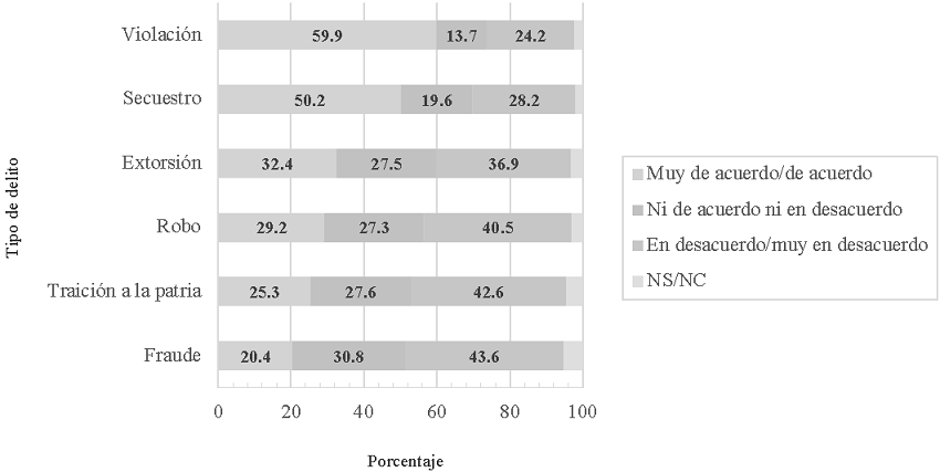 Otros delitos como la extorsión, el robo, el fraude, incluso la traición a la patria, obtienen porcentajes menores de aceptación, pero igualmente significativos. Es decir, casi cualquier delincuente es visto, por al menos uno de cada cinco personas, como alguien que puede ser sometido a tortura.7 Estas tendencias coinciden con los hallazgos presentados por estudios realizados en Estados Unidos, donde el respaldo a esta práctica violatoria de los derechos humanos se incrementa significativamente cuando se trata de “terrorismo” (Conrad y Moore, 2010).
