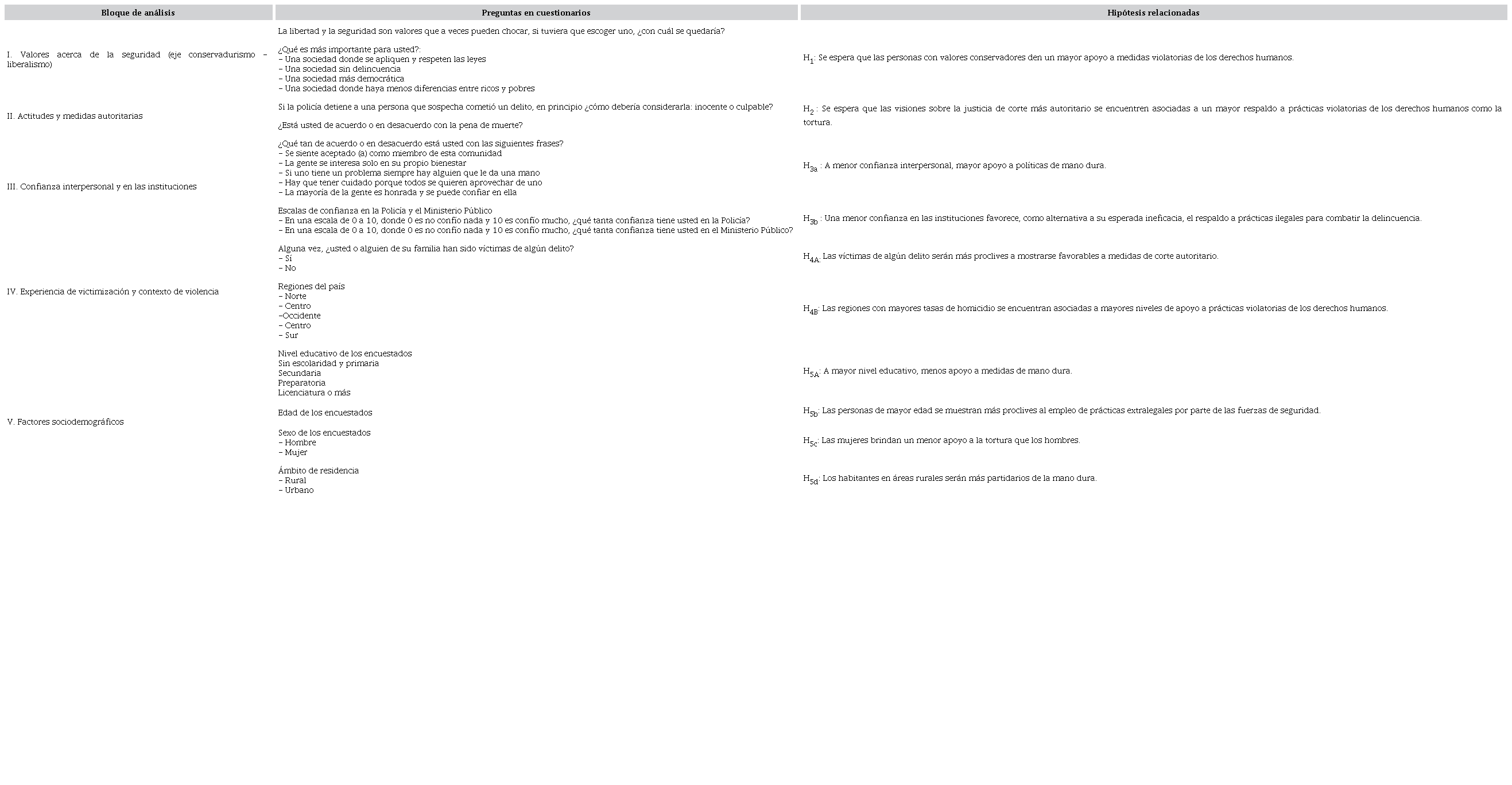 Tras una primera aproximación descriptiva a nuestro objeto de estudio, a continuación, trataremos de analizar las causas, perfil y principales rasgos distintivos del respaldo ciudadano a las políticas de mano dura extralegal en México. Para lograr el objetivo propuesto, y de acuerdo con el marco analítico planteado, se ha explorado la asociación existente entre el apoyo a medidas violatorias de los derechos humanos y cinco grupos diferenciados de variables independientes, cuyo procedimiento de operacionalización será detallado a lo largo de las siguientes líneas y sintetizado en la Tabla 1.