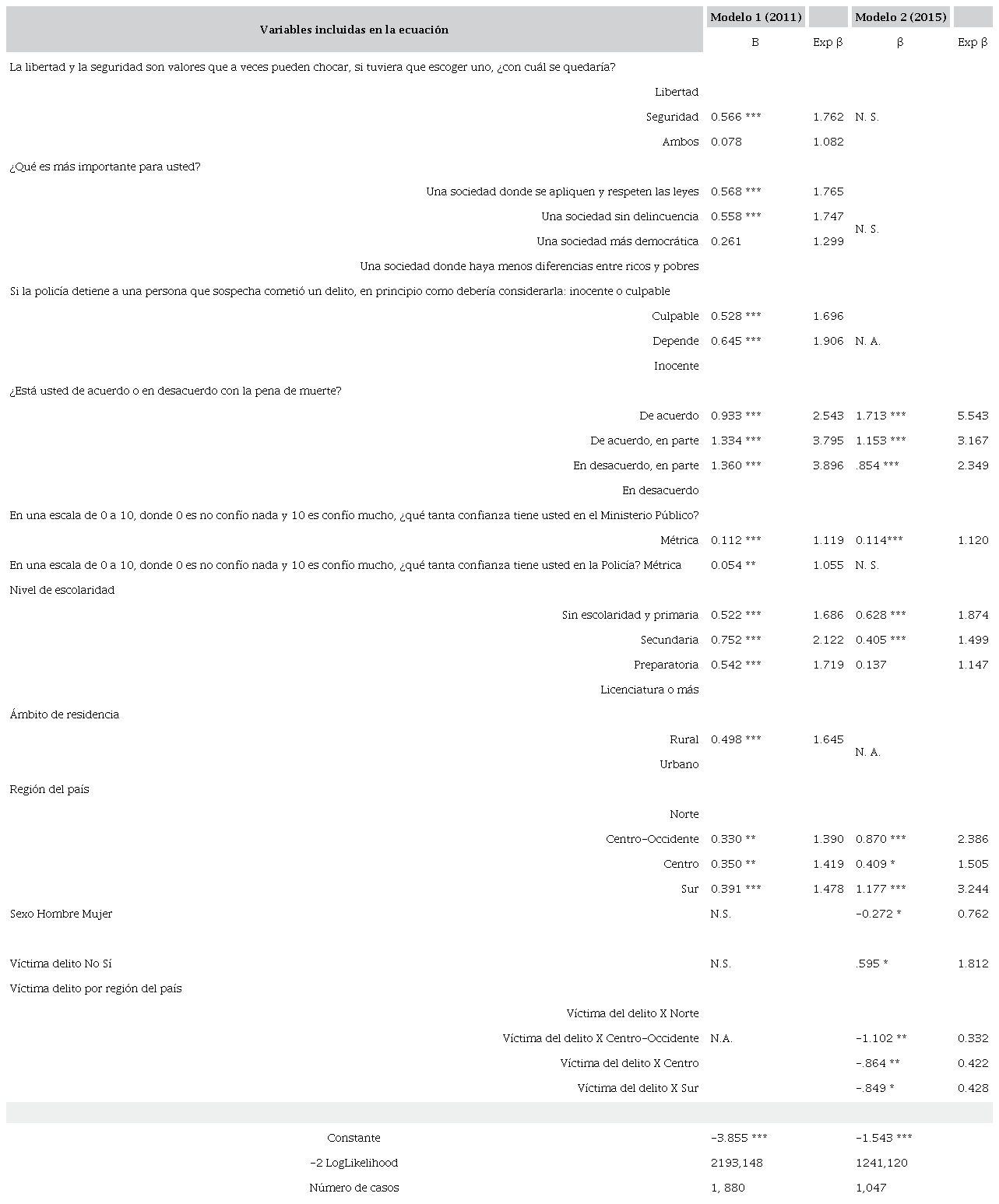 El análisis de las relaciones existentes entre la variable dependiente y las variables explicativas previamente expuestas se ha llevado a cabo a través del cálculo de dos Regresiones Logísticas Binarias. El diseño de las encuestas empleadas como referencia impide una réplica exacta de los modelos multivariados. Los cuestionarios de 2011 y 2015 no coinciden en todas las preguntas seleccionadas. No obstante, sí es posible establecer una comparativa que aporte información relevante sobre la robustez y carácter de los vínculos que se establecen entre el respaldo a prácticas violatorias de los derechos humanos, como la tortura de los detenidos, y las características personales y contextuales de quienes las secundan.