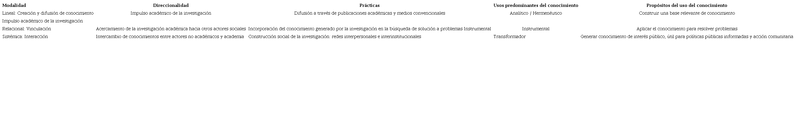 Asumiendo la idea de que la movilización de conocimiento tiene un fuerte componente de acciones más allá de la academia, en la siguiente tabla se presentan algunas de las dimensiones de análisis referidas a estos procesos que hemos adaptado a partir de la revisión presentada.