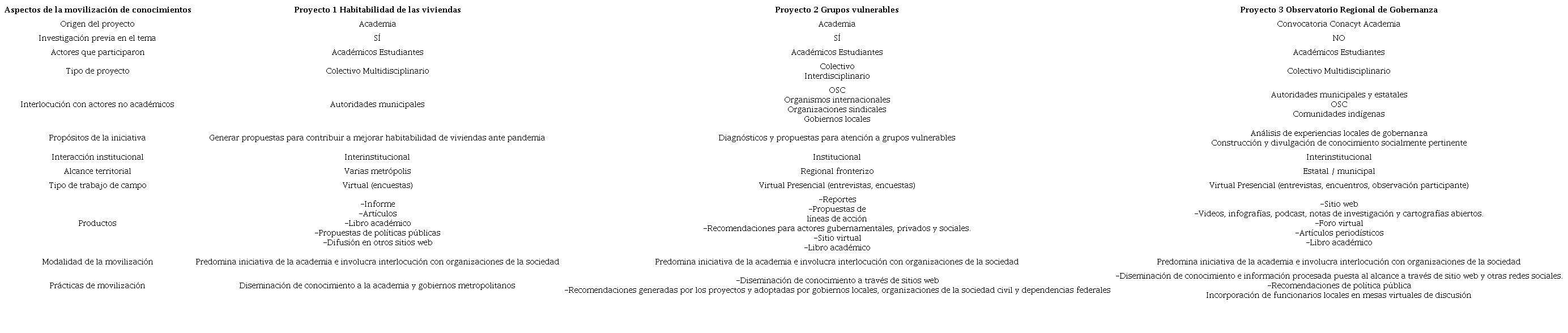 En el siguiente apartado se examinan con mayor detalle tres iniciativas generadas por centros académicos de ciencias sociales, lo que permite ahondar en el análisis de las dimensiones de la movilización de conocimientos.