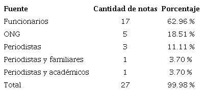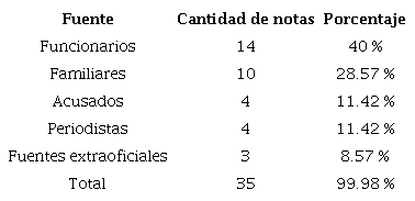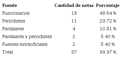En este caso se encontraron 42 notas que constituyen el universo. De ellas se descartaron 3 columnas y 4 reportajes, por lo que 35 notas informativas constituyen el corpus. En ellas se citan las siguientes fuentes: