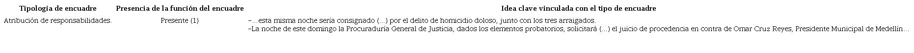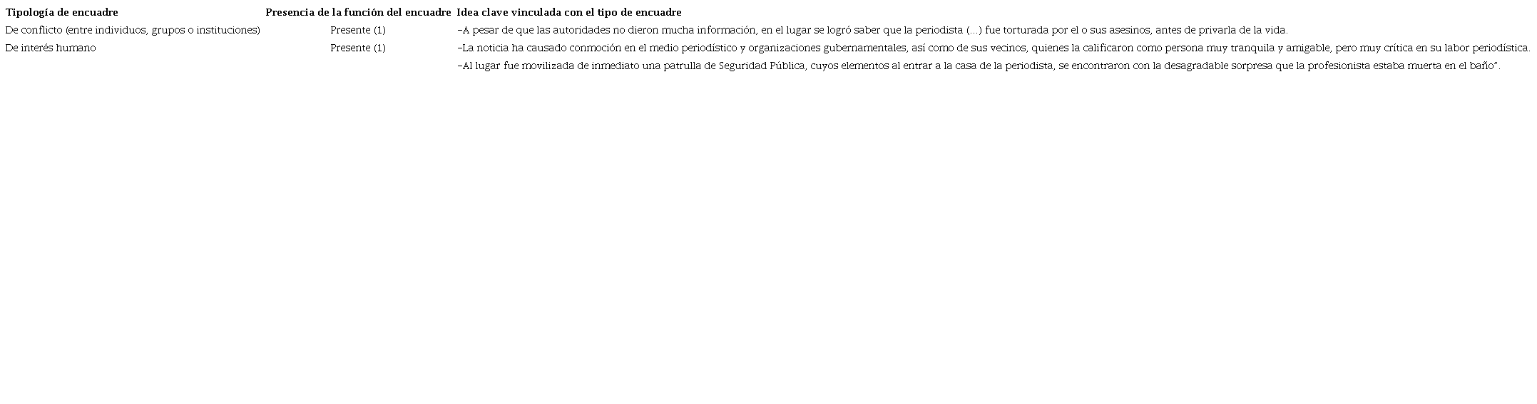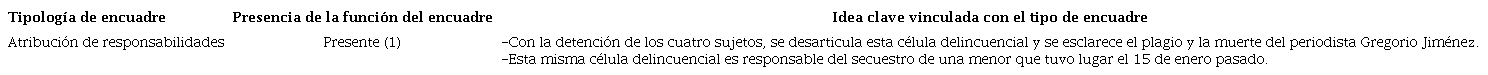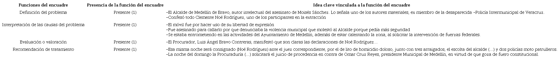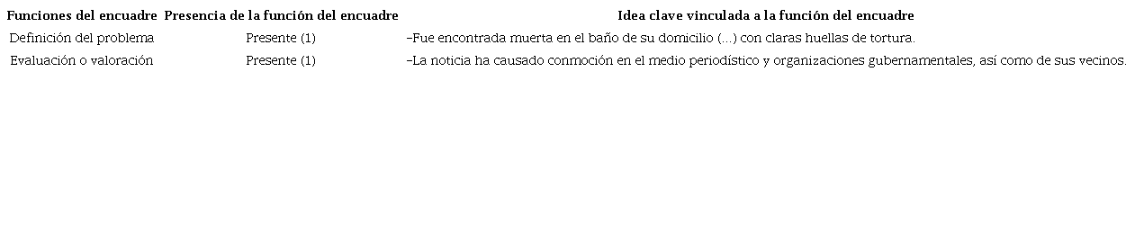Para analizar los encuadres, se adopta la metodología que sintetizó Portilla (2012) para el análisis de la cobertura sobre narcotráfico en la prensa mexicana. Esta metodología se expresa en tres fases o pasos. El primero está basado en la propuesta de Entman (1993) para identificar los encuadres por sus funciones: definición del problema, interpretación de las causas del problema, evaluación o valoración y recomendación de tratamiento (Portilla, 2012: 62). El segundo paso está basado en una propuesta de Valkenburg, Semetko y De Vreese (1999) para identificar el uso de encuadres genéricos: de conflicto, de interés humano, atribución de responsabilidades y consecuencias económicas (Portilla, 2012: 63). Aunque Portilla señala otros pasos, para los propósitos del presente artículo se considera conveniente usar sólo los primeros dos.