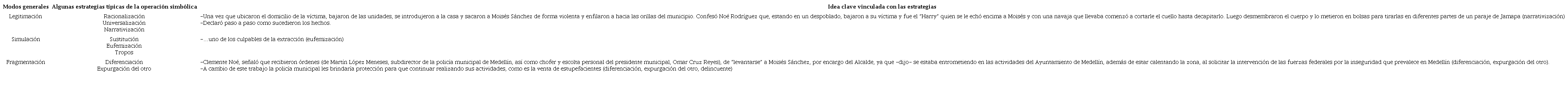 El análisis realizado en este artículo no se limita a estudiar las metáforas, como propone Portilla (2012), sino que se incorporan los modos de operación de la ideología con las estrategias típicas de operación simbólica propuestos por Thompson (1993) y que se sintetizan en el cuadro antes mencionado.