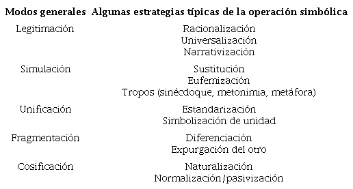Los acercamientos de John B. Thompson al estudio de la ideología trasmitida a través de los mensajes de los medios resultan complementarios. Los medios enmarcan la realidad para presentarla a los lectores de manera comprensible, y las representaciones de la misma dependen de esos marcos. Además, los medios trasmiten ideología, entendida como “significado al servicio del poder” (Thompson, 1993: XVI) y su estudio implica analizar “las maneras donde las formas simbólicas se intersectan con las relaciones de poder” (Thompson, 1993: 85). Es útil para entender cómo estas formas simbólicas sirven en ciertas circunstancias “para establecer y sostener las relaciones de dominación” (Thompson, 1993: 85). El autor presenta cinco modos de operación de la ideología que se muestran en la Tabla 1 (Thompson, 1993: 91):