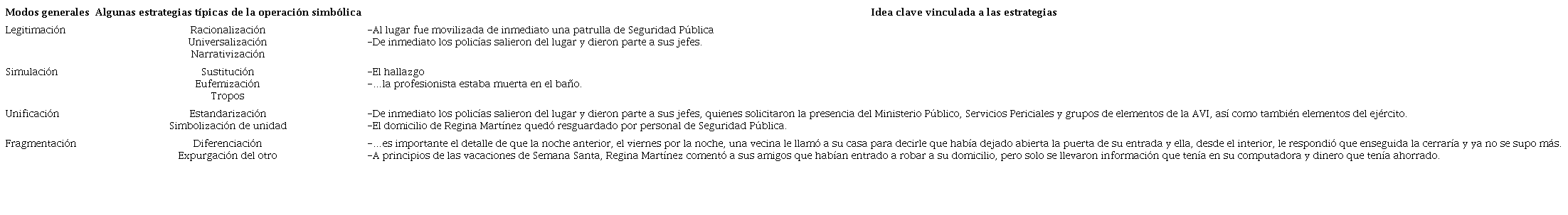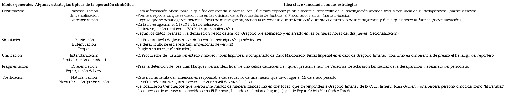 En los tres casos se acude a estrategias de legitimación, de simulación de unidad y de fragmentación, dando a entender con ello que las autoridades están a cargo de la resolución de los crímenes y están cumpliendo con su labor: “de inmediato fue movilizada una patrulla”; “de inmediato los policías […] dieron parte a sus jefes”; se dio “información oficial […] para explicar puntualmente”, “[…] se desahogaron diversas líneas de investigación”; el delincuente confeso “declaró paso a paso cómo sucedieron los hechos”. Sobre todo, es importante señalar que los últimos dos crímenes se presentaron como resueltos.