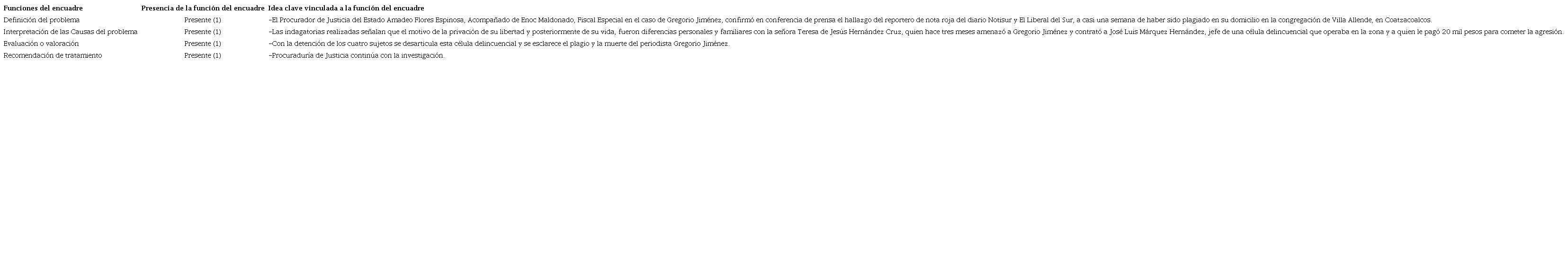 Se tomó como ejemplo la nota publicada en el periódico digital Alcalorpolitico.com el 11 de febrero de 2014: “Localizan al periodista Gregorio Jiménez en Las Choapas; lo asesinaron”. La nota está firmada por Hugo Cruz Ojeda; sin embargo, la mayor parte de ella cita textualmente el boletín de la PGJ estatal y la conferencia de prensa (Cruz, 2014). Como macroestructuras semánticas, se consignan las siguientes: el tema es el hallazgo del periodista en Las Choapas, población del sur del estado, y la afirmación de que fue asesinado. Resaltan cinco bajantes que resumen el tema general.