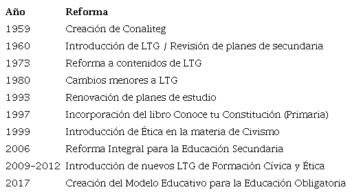 En materia de educación cívica, México ha reformado los programas y materiales didácticos en varias ocasiones desde 1959.