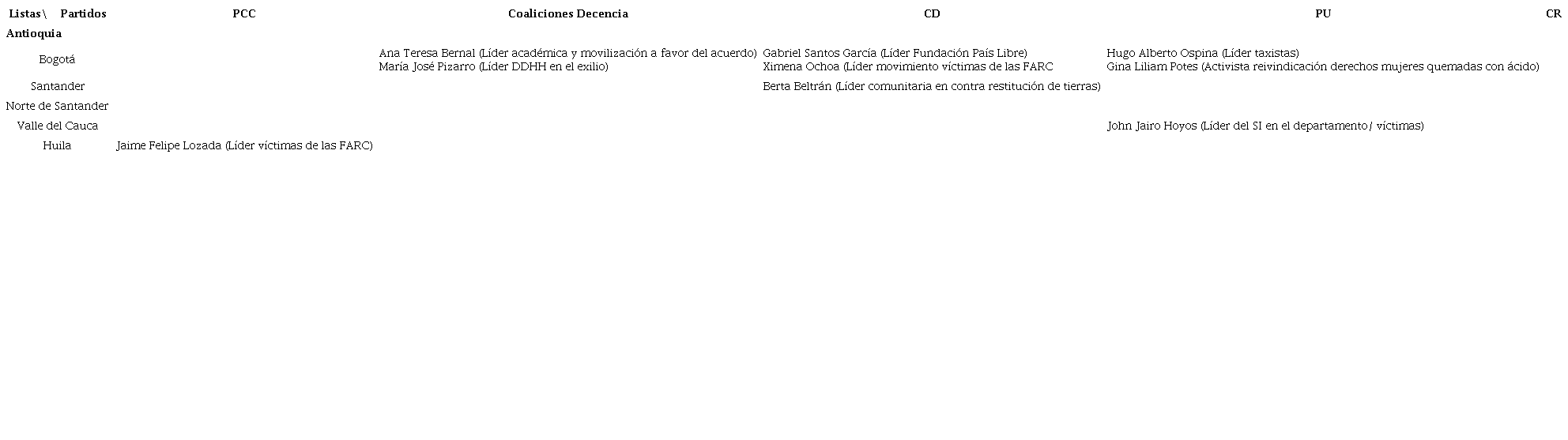 Paralelamente a los resultados de las listas presentadas por los partidos con experiencia electoral, se destaca en estas elecciones la lista presentada por nuevos partidos y coaliciones como la Lista de la Decencia, constituida por MAIS, ASI, Unión Patriótica (UP), Todos Somos Colombia y el partido progresista Colombia Humana, organización que capturó por la naturaleza ideológica y estratégica, una “multiplicidad de líderes de organizaciones y movilizaciones sociales de diversa índole y con presencia en el ámbito nacional y departamental” (Durango, 2017).