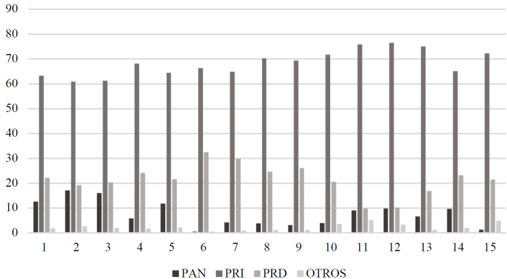 En 2012, se mantuvo en el multipartidismo con 3.7 partidos: PRD-PRI-PAN-PSD. Para esta elección, la volatilidad afectó el orden de los partidos: El PRD fue el partido dominante, el PRI ascendió a la segunda posición, el PAN se convirtió en la tercera fuerza y, al obtener el 4.12 % de los votos, el PSD ocupó la cuarta posición. Finalmente, en 2018 se reconfiguró como un sistema de partido que parece tener las características de predominante,10 con 1.3 partidos, a partir del triunfo de la coalición PES-MORENA-PT. Sin embargo, ello habrá de corroborarse en las siguientes tres elecciones consecutivas.