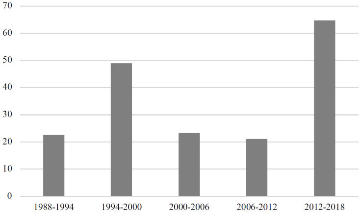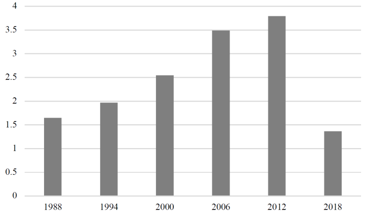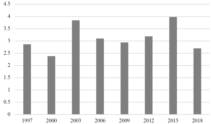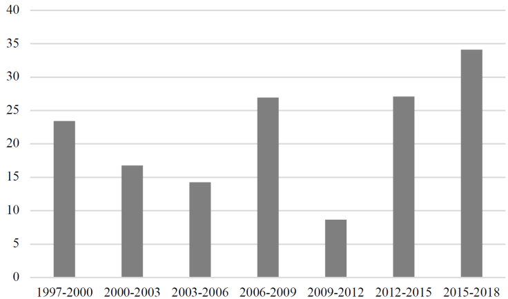 El caso del congreso es diferente, puesto que se observa mayor estabilidad en las elecciones para diputados, manteniéndose la volatilidad como media-alta. El promedio de 1997 al 2018 es de 21.6 (Gráfica 4). Los años en los que más elevada ha estado fueron las elecciones de 2009, 2015 y 2018, con 26.95, 27.1 y 34.1 por ciento. Así, en 2018, ascendió a la categoría de volatilidad alta.