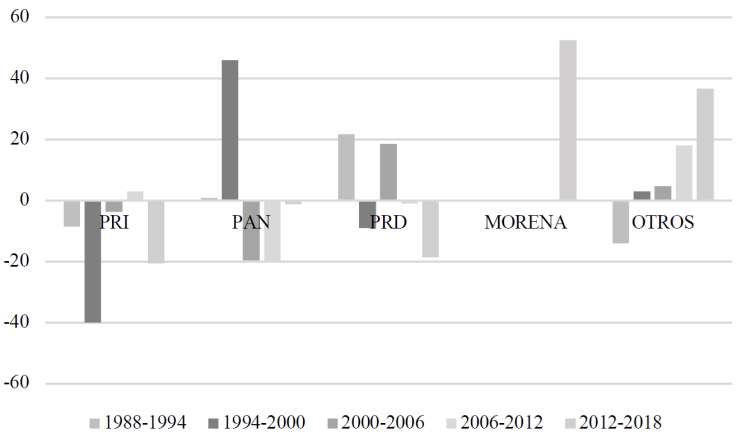 Esto significa que en los periodos de 1988-1994, 2000-2006 y 2006-2012, la volatilidad fue media alta, y en las elecciones de 1994-2000 y 2012-2018 fue extrema. Dicho en otras palabras, los partidos perdieron sus bases de votantes. En la Gráfica 3 se observan con mayor claridad las pérdidas y ganancias en votantes por partido político.