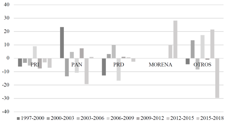 En el caso del PRI, las pérdidas han oscilado en promedio alrededor de 5.41 %, salvo en 2009 que ganó el 9 % de votantes. El PAN en las elecciones de 2003, 2009 y 2015 perdió en promedio 14.46 %, y en 2000, 2006, 2012 y 2018 ganó 9.1 %. La pérdida más notoria fue en 2015 con 19.2 %. El PRD disminuyó en promedio en 10.66 %. Las ganancias oscilaron alrededor de 3.77 % en las elecciones de 2003, 2006, 2012 y 2015.